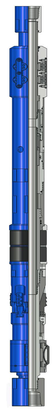 該封隔器是一種具有同軸旁通的懸掛式可回收封隔器。當(dāng)工具進(jìn)入井中時J型槽保持旁通打開,同時控制封隔器座封,當(dāng)封隔器座封后,油管壓力驅(qū)動驅(qū)動平衡活塞,保持旁通關(guān)閉。